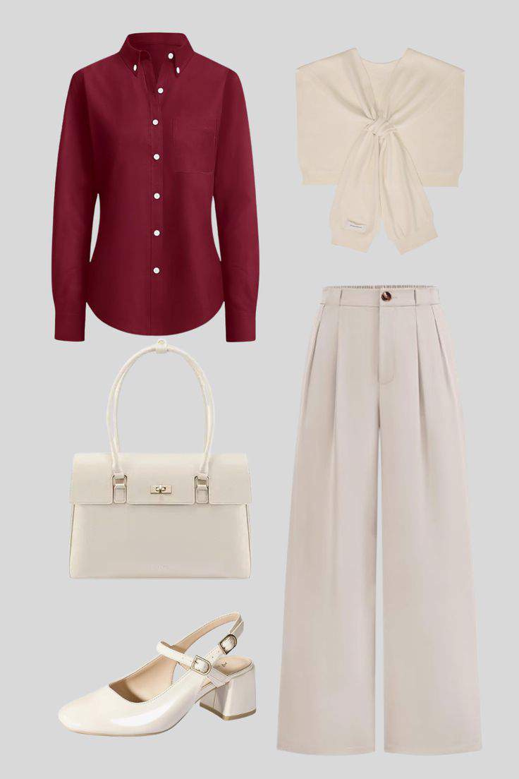Categories: Elegant Burgundy & Cream Office Chic Outfit, Office Outfits, Winter Aesthetic